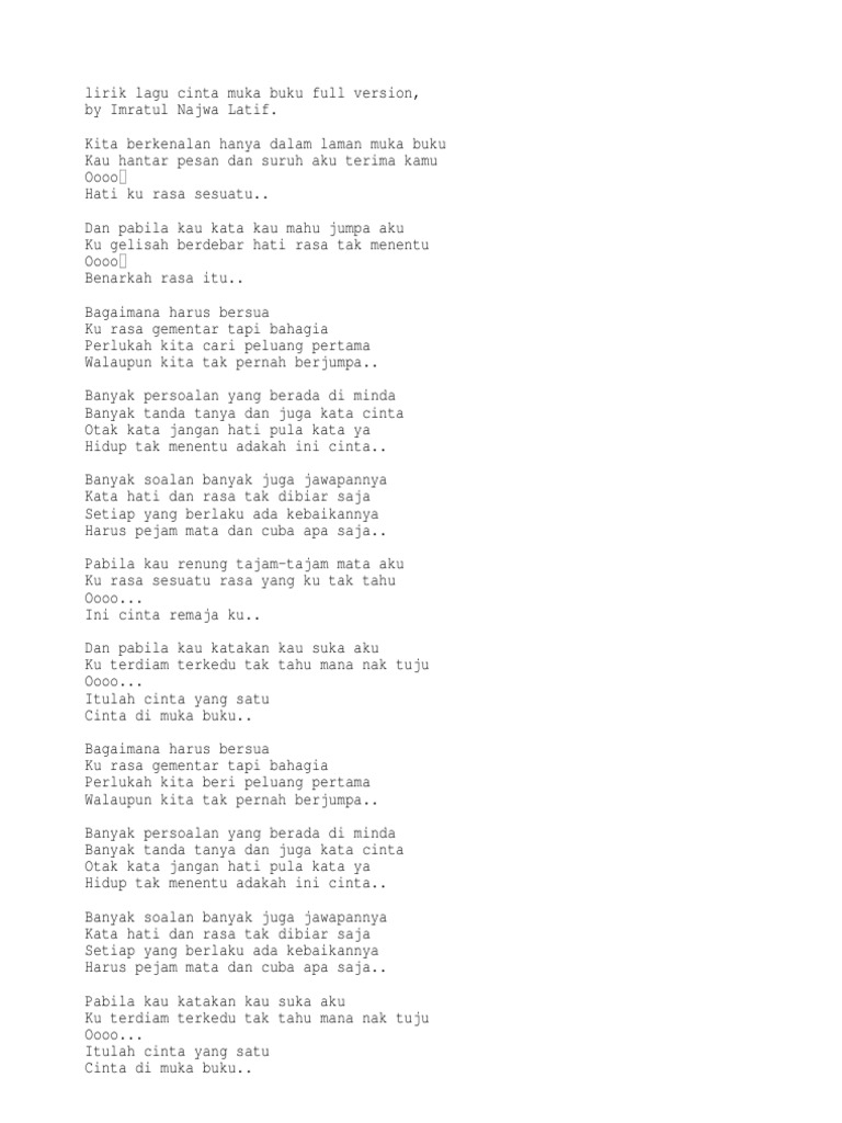Related : Cinta Muka Buku Lirik : Lirik Cinta Muka Buku Najwa Latif Lirik Lagu Malaysia : Kita berkenalan hanya dalam laman muka buku kau hantar pesan dan suruh aku terima kamu oh oh hatiku rasa sesuatu dan pabila kau kata kau mahu jumpa aku ku..