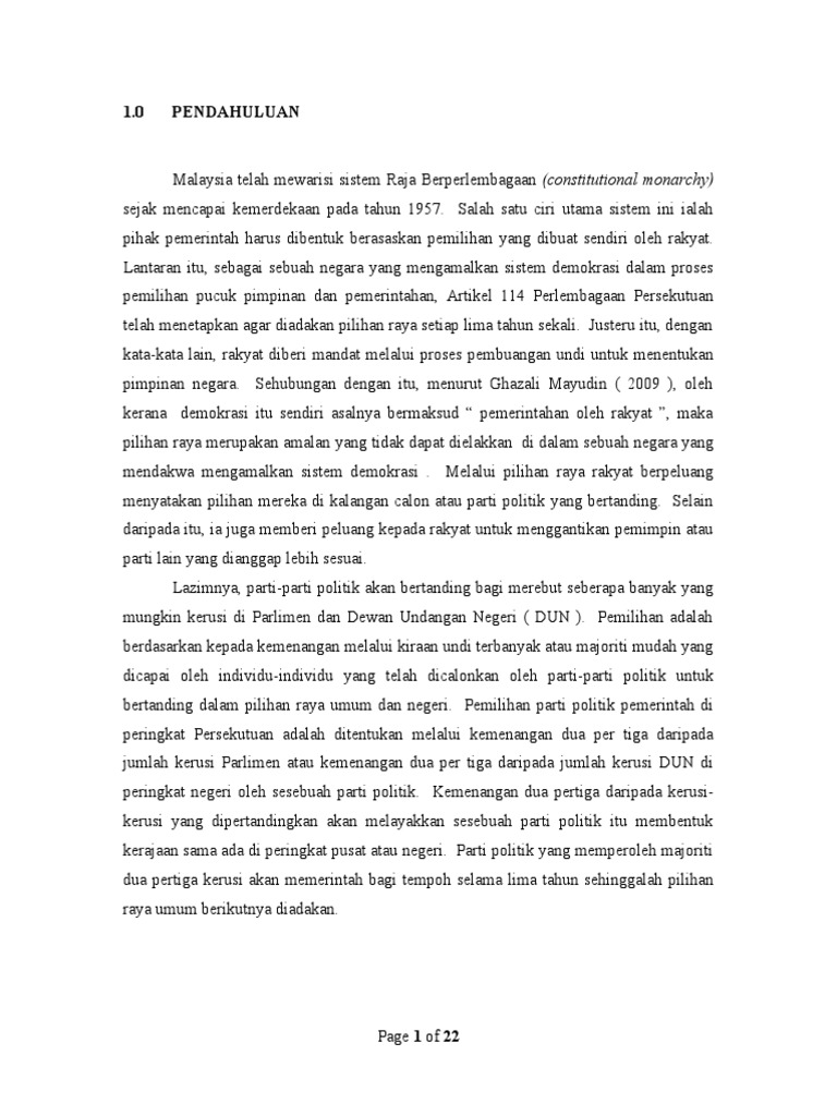 Apa yang berlaku di sabah perlu diteliti dan diambil pengajaran sekiranya politik negara masih tidak stabil sehingga menyebabkan parlimen terpaksa dibubarkan dan. (b) berikan dua keadaan yang menyebabkan seseorang itu tidak layak menjadi calon untuk bertanding dalam pilihan raya. Dalam sistem kerajaan demokrasi berparlimen seperti yang dipraktikkan oleh malaysia, mekanisme pilihan raya telah digunakan untuk menentukan corak pemerintahan negara. Perkataan 'pilihan raya' adalah tidak asing di kalangan rakyat malaysia khususnya negara baharu sahaja menjalani dua proses pilihan raya kecil bagi memilih wakil. Mengikut perlembagaan malaysia suruhanjaya pilihan raya spr diberi kuasa untuk menyelia pentadbiran dan perjalanan pilihan raya.