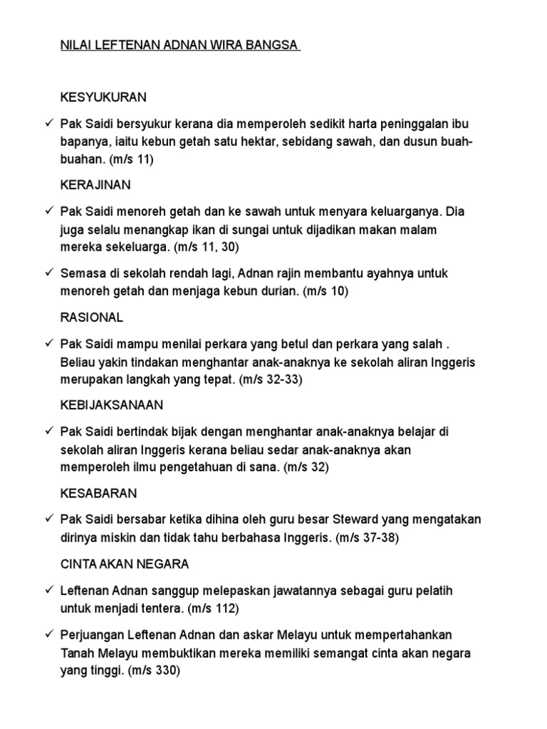 Persoalan harapan seorang ayah terhadap anaknya. Latar tempat yang pertama ialah kampung sungai ramal.adnan sekeluarga tinggal di kampung sungai ramal. Adnan berani mengejar(chase) lembaga(a group of people) yang menceroboh(trespass) masuk ke kawasan rumahnya pada waktu malam walaupun(even though). Novel leftenan adnan wira bangsa : Cicit lt adnan imbau kenangan 76 tahun lalu. This study entitled analysis of the novel leftenan adnan wira bangsa work abdul latip bin talib with the objective to study the thinking of the author in his work which is related to the events he undertook as well as though the experiences of other individual that are adapted in this novel. Keistimewaan yang pertama adalah daripada pengutaraan tema yang baik oleh pengarang. Download lagu wira wira bangsa mp3 gratis dalam format mp3 dan mp4. Leftenan adnan terkorban dan mayatnya digantung di dahan pokok ceri. Leftenan adnan wira bangsa novel komponen sastera (komsas) dalam mata pelajaran bahasa malaysia tingkatan 4 (selangor, wilayah persekutuan labuan, putrajaya, negeri sembilan). Sinopsis bab demi bab, tema, persoalan, watak dan perwatakan, latar masa, latar tempat, latar masyarakat, plot, teknik penceritaan, nilai, pengajaran, soalan peperiksaan + skema jawapan, contoh soalan + jawapan : Pada awal penceritaan,novel ini mengisahkan kehidupan adnan semasa kecil.beliau dilahirkan di sebuah kampung di sungai ramal,selangor. Yang terdapat di dalam novel leftenan adnan.