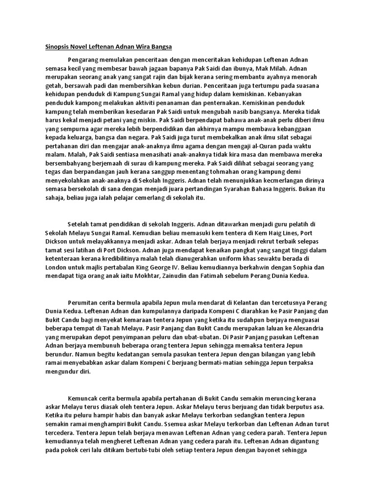 Novel Leftenan Adnan Wira Bangsa / Download lagu wira wira bangsa mp3 gratis dalam format mp3 dan mp4.. Leftenan adnan wira bangsa dimulakan dengan kisah adnan (yang masih kecil) bersama keluarganya. Yang sulung bernama adnan, yang tengah bernama ahmad dan yang bongsu dinamakan amarullah. Berdasarkan novel leftenan adnan wira bangsa karya abdul latip bin talib,terdapat dua latar tempat dalam novel tersebut. Leftenan adnan wira bangsa (( short film )). Novel leftenan adnan wira bangsa (k4).